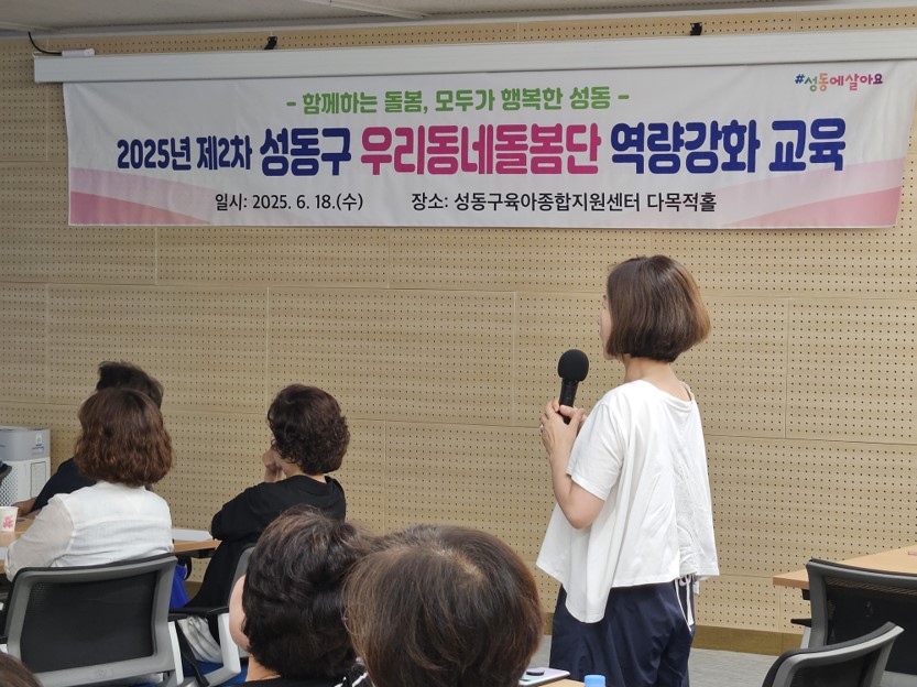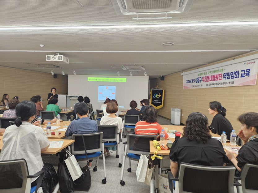 6월 18일(수), 성동구 육아종합정보센터 지하 1층에서 성동구 관내 각 동의 우리동네 돌봄단 41명을 대상으로 <찾고 나누고 이어주며 행복하게 소통하는 우리동네 돌봄대장>이라는 주제의 워크숍을 진행하였습니다.