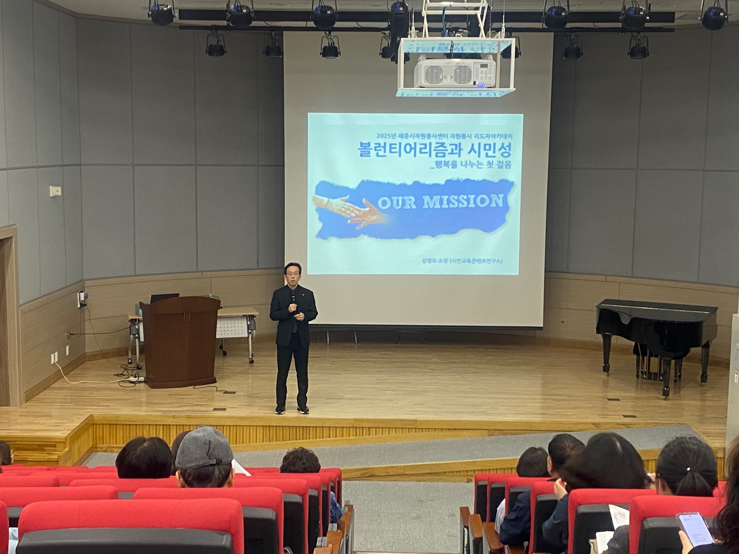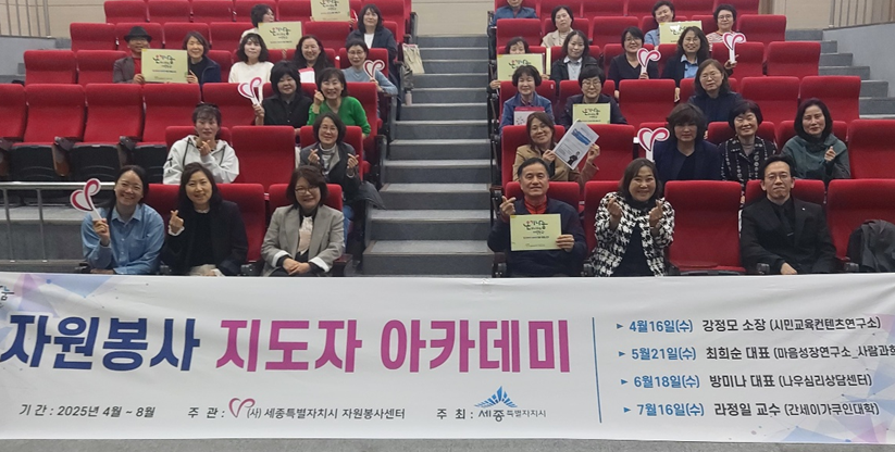 25년 4월 16일 오후 3~5시까지 보람동행복누림터에서 세종시자원봉사센터에서 주관하는 자원봉사 지도자 아카데미에 초대받아 <행복을 나누는 첫걸음, 볼런티어리즘과 시민성>이라는 제목의 특강을 실시하였습니다.