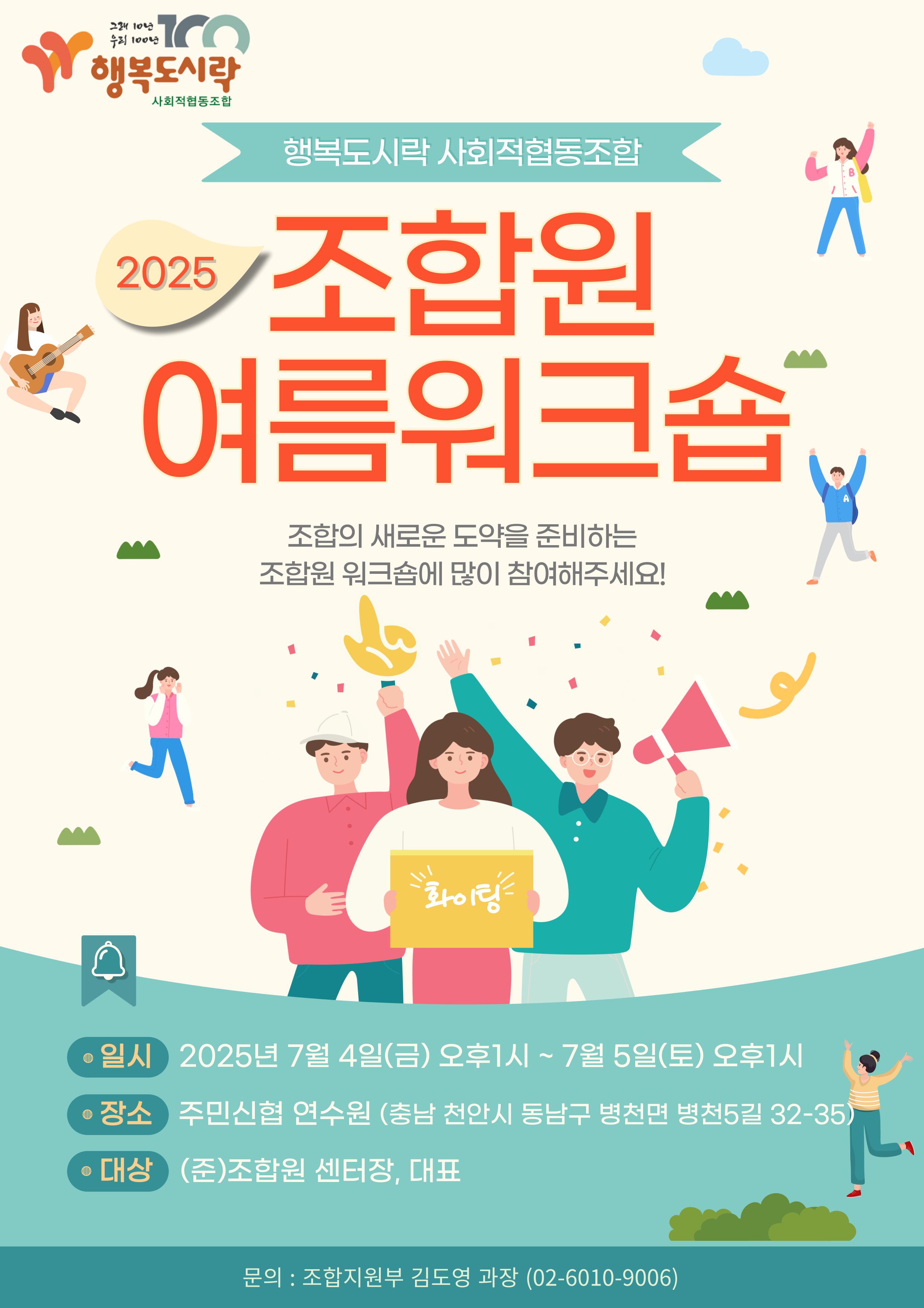 사회적협동조합 행복도시락은 2025년 7월 4일(금)부터 5일(토)까지 충남 천안시 소재 주민신협 연수원에서 '조합원 여름 워크숍'을 성공적으로 개최하며 새로운 도약을 준비했습니다. 조합의 미래를 이끌어갈 (준)조합원 센터장 및 대표들을 대상으로 '이해'와 '소통'을 핵심 주제로 진행되었습니다. 특히, 7월 5일(토) 오전에는 강정모 소장(시민교육콘텐츠연구소)이 "<소통 특강> 갈등을 성장의 원동력으로!"라는 주제로 워크숍을 실시하였습니다.