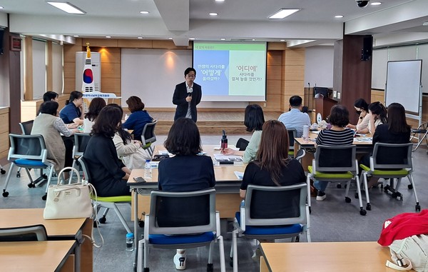 인천남부교육지원청(교육장 박종하)은 관내 교육복지사 42명을 대상으로 ‘2023년 교육복지사 직무연수’를 지난 8월부터 11월 7일까지 3가지 주제로 운영했습니다. 두 번째 교육으로 ‘신뢰를 만드는 다섯 가지 성장 습관’을 주제로 사회복지사 출신인 강정모 시민교육콘텐츠연구소장이 강의했습니다. 전문가로서 방향성이 명료한 성장에 대한 내용을 핵심적으로 다뤘습니다.