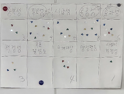 워크숍은 시민교육콘텐츠연구소의 전문 퍼실리테이션 아래 분과별로 진행되었습니다. 위원들은 먼저 주민 제안 사업 검토를 위한 핵심 기준을 투표를 통해 선정했습니다.(예: 필요성, 공공성, 시급성 등)