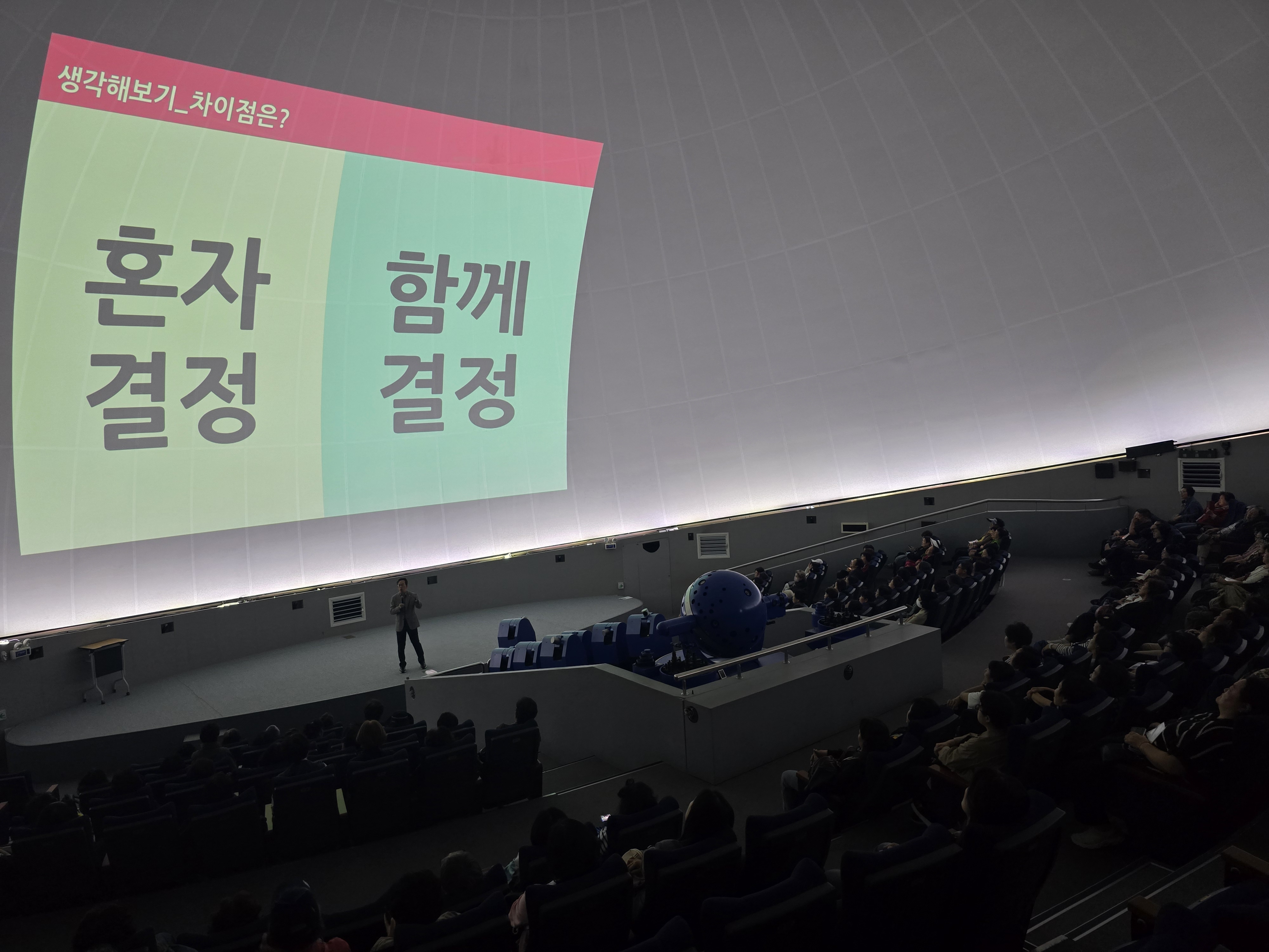 이번 교육은 평소 접하기 어려운 국립과천과학관 천체투영관이라는 특별한 장소에서 진행되어 교육의 집중도를 높였습니다. 약 400여 명(통장 및 위원 각 200명)의 영등포구 마을 리더들이 참석한 가운데, 참가자들은 강정모 소장의 깊이 있는 강의에 귀 기울이며 높은 학습 열의를 보였습니다. 효과적인 주민 간 소통 실습 등을 통해 현장 활동에 바로 적용 가능한 실질적인 역량을 키웠습니다. 성장하는 영등포 공동체를 향한 리더들의 뜨거운 열정을 느낄 수 있는 의미 있는 시간이었습니다.