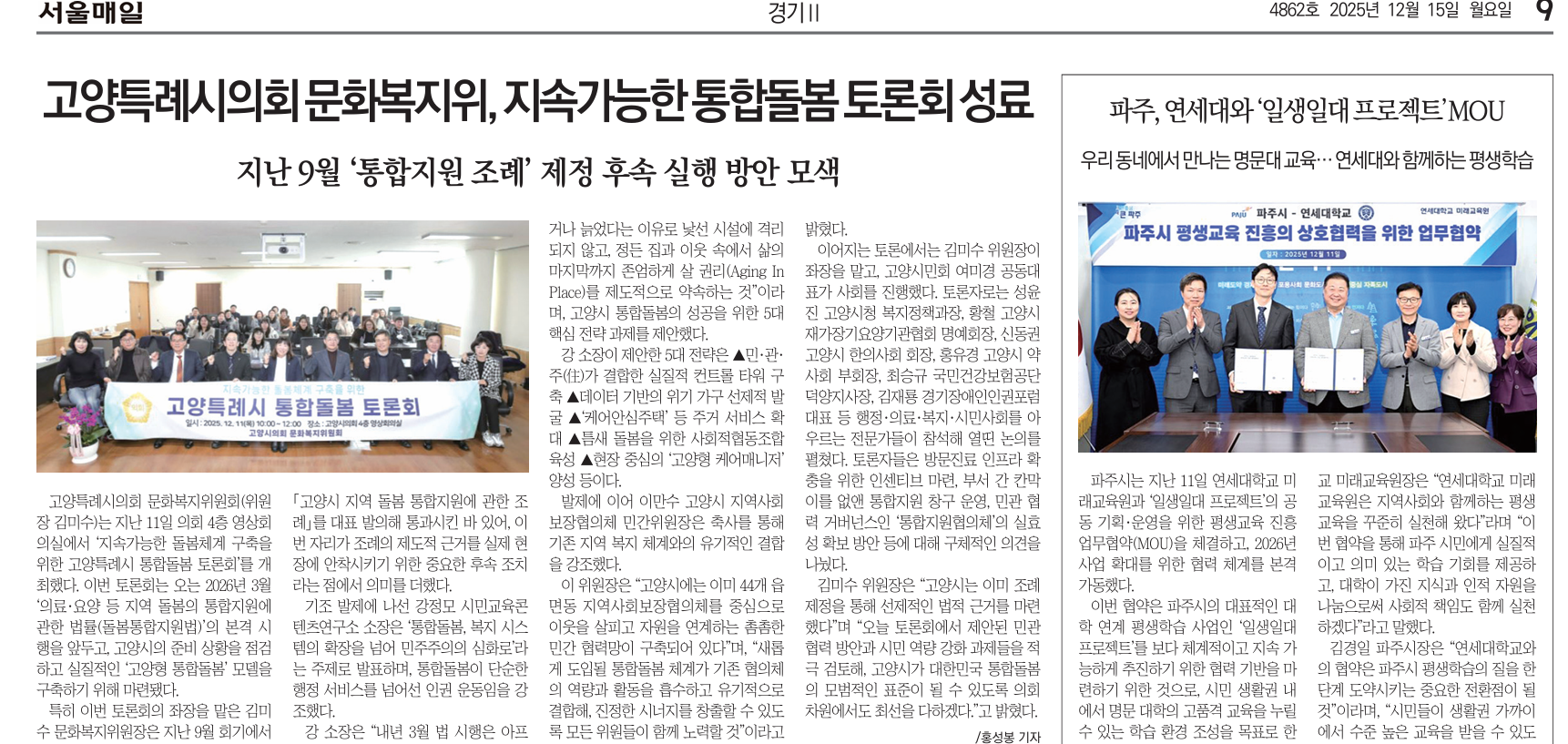 2026년 ‘돌봄통합지원법’ 시행 대비, 민·관·주 협력 통한 고양형 모델 모색