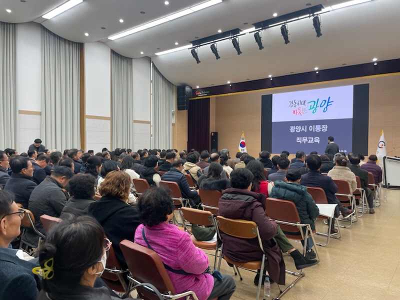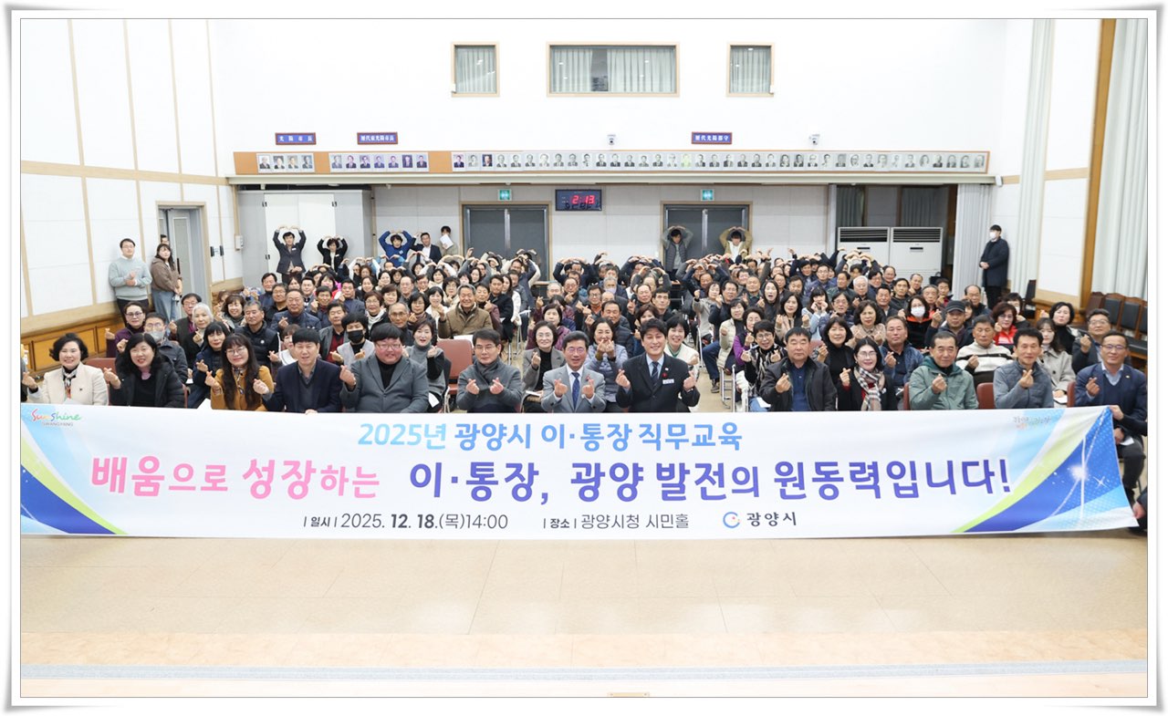 전남 광양시 마을 이통장님들을 대상으로 직무교육을 2025년 12월 18일 광양시청에서 진행하였습니다. 이번 마을 이·통장 교육은 단순한 행정 전달자를 넘어, 마을 소통의 중심이자 공동체를 이끄는 복지리더로서의 역할을 함께 고민하는 내용으로 구성하였습니다. 현장에서 주민과 가장 가까이에서 호흡하며 마을을 지켜오신 이·통장님들의 경험과 고민을 경청하고 타지역 사례를 공유하였습니다.