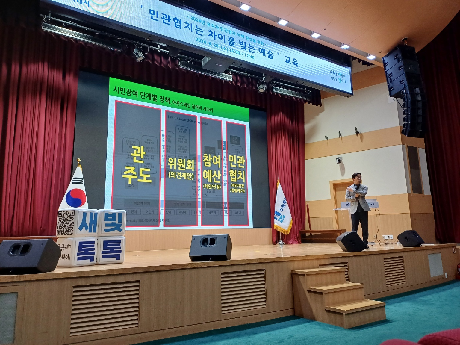 24년 8월 28일, 수원특례시청에서는 공직자들의 민관협치 역량을 강화하기 위한 특별한 시간이 마련되었습니다. '민관협치'라는 다소 딱딱할 수 있는 주제를 "민관협치는 차이를 빚는 예술"이라는 시각으로 풀어냈습니다.