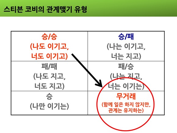 서로가 이익을 얻는 승승의 대안을 찾지 못할 때가 있습니다. 이때는 무거래(No Deal)를 선택하는 것이 현명합니다. 무거래는 서로의 견해 차이를 인정하고 거래하지 않기로 합의하는 것입니다. 억지로 합의하여 관계를 망치기보다, 기대를 내려놓고 다음 기회를 기약하는 것이 관계를 건강하게 유지하는 길입니다. 무거래라는 선택지가 있을 때 우리는 상대에게 자신의 계획을 강요하지 않고 더 개방적인 태도를 가질 수 있습니다. 좀 더 무거래를 한국적 맥락에서 해석하면 '관계는 유지하되, 일은 그만두는 것'이라고 경험적으로 적용해봅니다. 현장에서 일을 하다가 승승을 추구하려고 아무리 노력해도 '그 과업'에서 팀워크가 나지 않을 경우가 있습니다. 그런데 억지로 일을 추진하다보면 관계까지 단절되어, 적대관계로 악화되는 경우가 많습니다. 그래서 승승을 추구하되, 도저히 불가능할 것 같으면 관계를 유지하면서 그 과업은 출구전략을 통해 마무리하는 것이 승승을 추구하는 태도의 일환이라고 생각합니다. 관계를 훼손하지 않으면 혹시 다른 과업에서는 좋은 협력을 할 가능성도 있기 때문입니다.