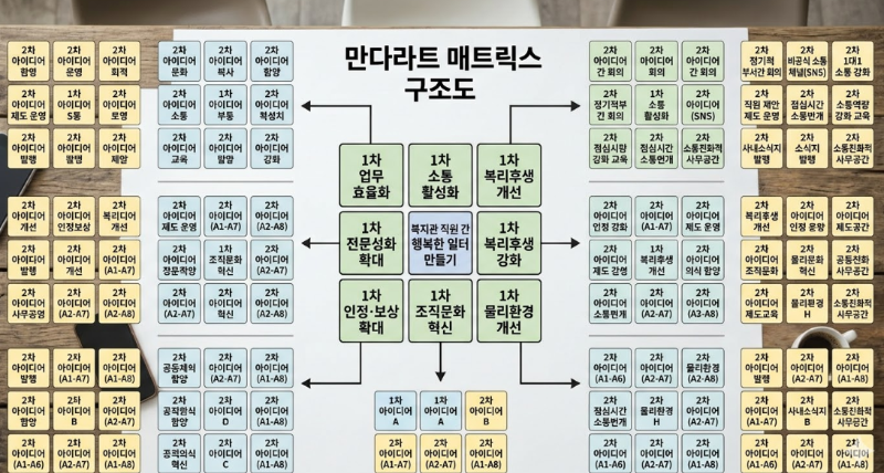직원 연수 날, 전 직원 30명이 모였다. 중앙 주제는 [우리가 출근하고 싶은 행복한 복지관 만들기]였다. 처음엔 서먹했다. 하지만 만다라트의 '강제 배당' 원칙은 힘을 발휘했다. 1차 의제로 '업무 프로세스', '휴식의 질', '부서 간 협업', '물리적 환경' 등이 도출되었다. 흥미로운 장면은 '업무 프로세스'라는 세부 주제를 채울 때 벌어졌다. 사회복지사들은 '서류 간소화'를 적었지만, 행정직 직원은 '지출 결의 서류의 정확성 기일 준수'를 적었다. 만다라트 칸 안에서 서로의 고충이 시각적으로 충돌하고 동시에 이해되는 순간이었다. "아, 행정 선생님들이 우리 서류 늦는 것 때문에 그렇게 스트레스를 받으셨구나." 박소통 복지사는 칸을 채워가며 동료의 얼굴을 다시 보게 되었다.