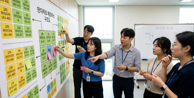 "저기... '주차장 공유 시간표'를 만들면 어떨까요? 저는 낮에 출근하니까, 그 시간에 밤샘 운전하시는 앞집 아저씨가 제 자리에 주차하실 수 있게요." 순간 회의실에 탄성이 터졌다. 평범한 브레인스토밍이었다면 목소리 큰 사람들에 묻혀 나오지 못했을 섬세한 아이디어였다. 만다라트가 제공한 구체적인 렌즈가 주민의 내면에 있던 지혜를 길어 올린 것이다.