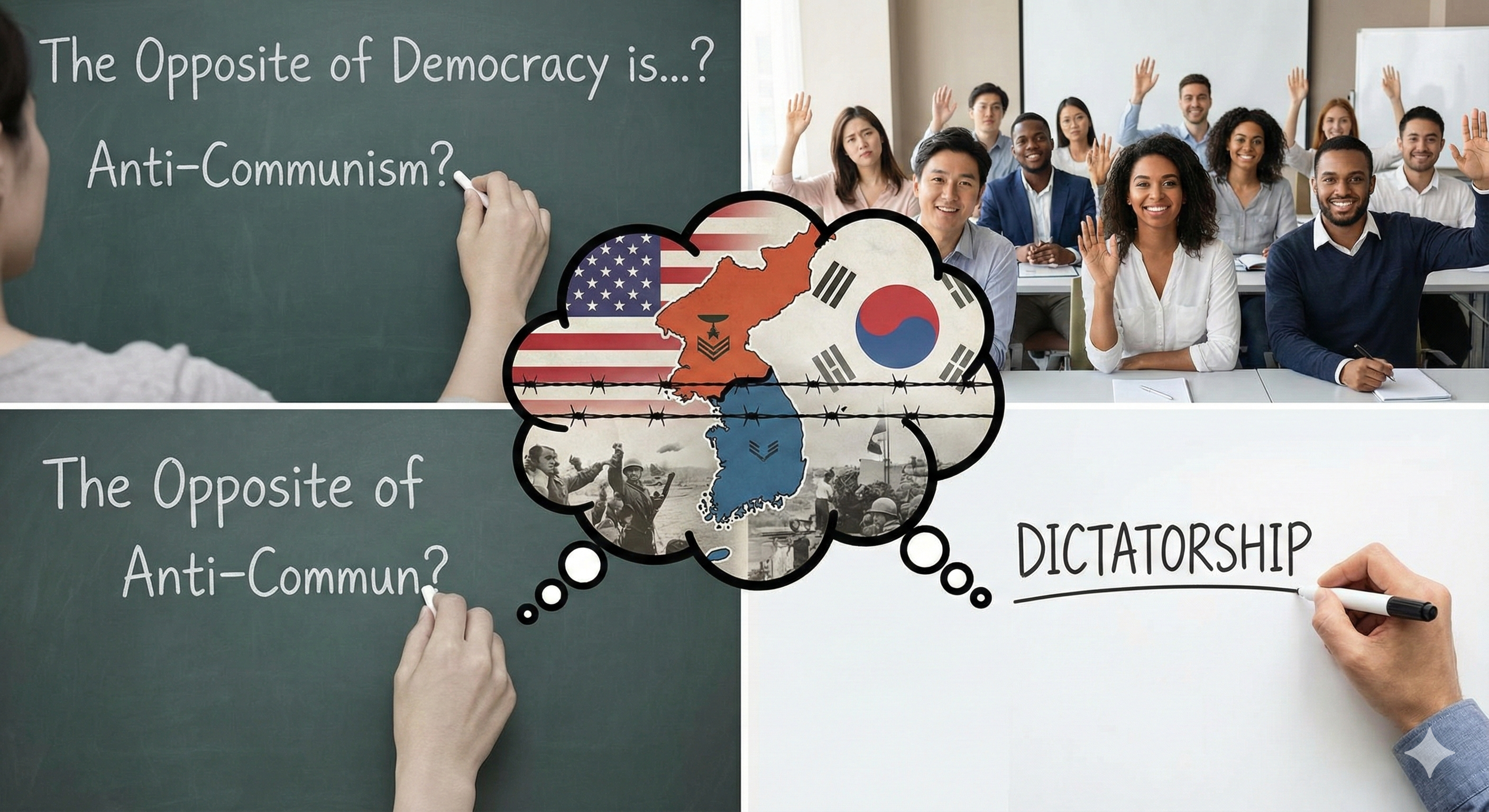 시민교육현장에서 참가자들에게 민주주의의 반대가 무엇인지 질문하면 당혹스러워하거나 공산주의라고 한다. 비단 노인들뿐만 아니라 청소년들도 마찬가지다. 하지만 외국인들이나 중국동포들에게 질문하면 ‘독재’라고 한다. 고려와 조선의 국시(國是)가 무엇이냐고 물으면 대다수의 참가자는 불교와 유교라고 한다. 공교육의 결과다. 하지만 대한민국의 국시를 물으면 우물쭈물거리다 한 두분이 “반공!”이라고 한다. 역시 대한민국 공교육의 결과다. 자유, 민주, 공화라는 독립의 선현들이 피땀으로 세운 국가의 이념보다는 공산주의 반대라는 공허한 분단의 산물이 21세기를 살아가는 대한민국 시민의 의식토대다.