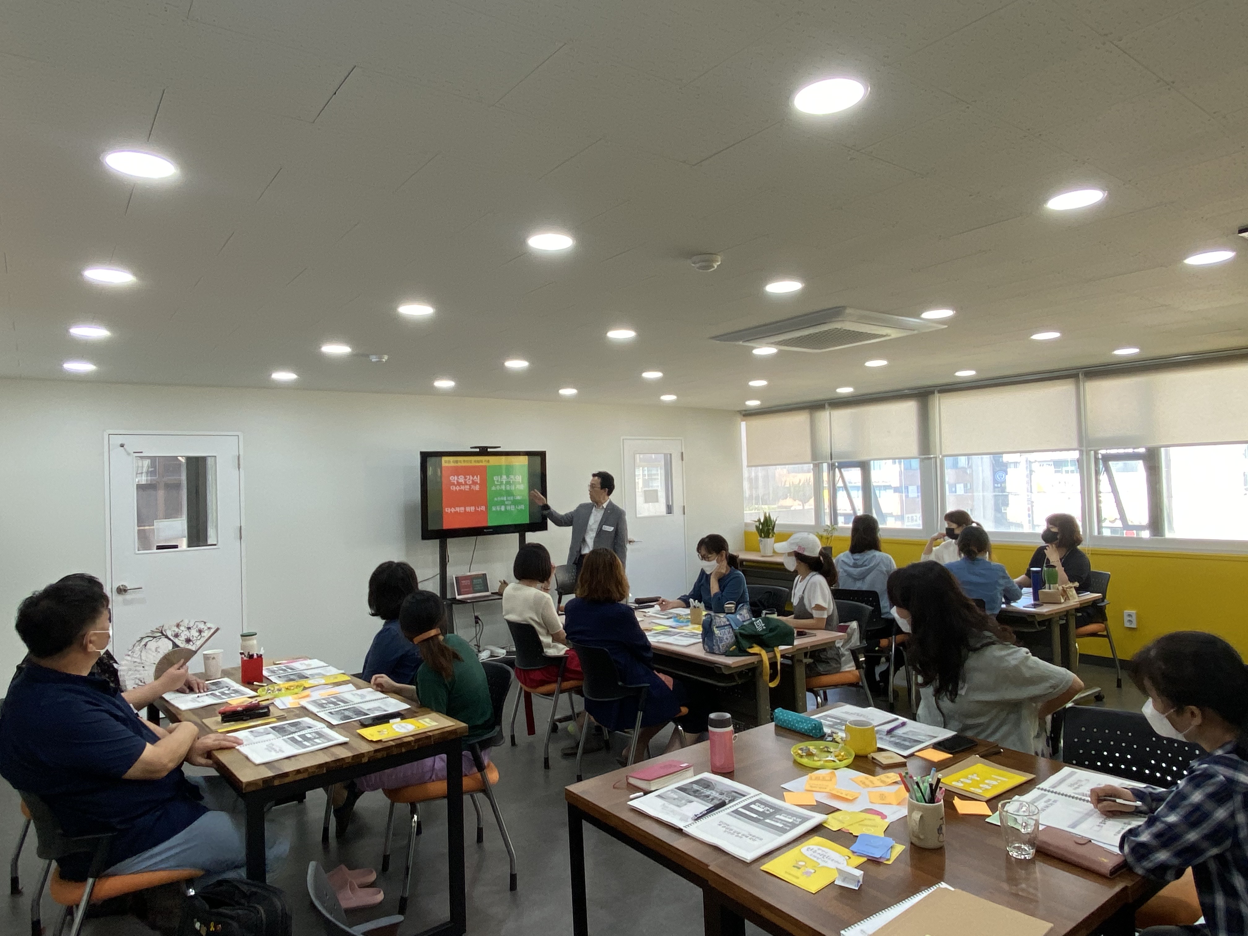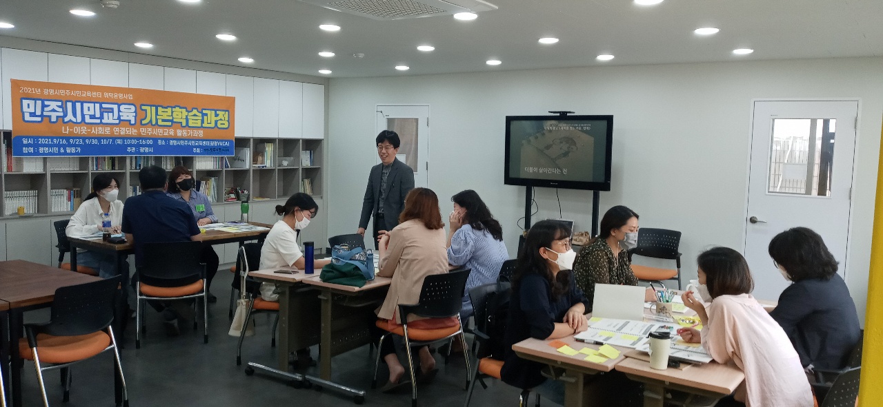 20년에 개발한 광명시민주시민교육 16과정을 적용하였습니다. 하반기부터는 [이웃과 민주주의]와 [사회와 민주주의]를 실행됩니다. 강정모 소장은 '민주주의를 통해 이해하는 갈등과 의사소통'을 2회 차에 걸쳐 교육하였습니다. 광명의 시민과 활동가들이 크고, 작은 공적모임을 운영하면서 민주주의를 일상에서 적용하도록 구체적 활동내용을 적용하였습니다.