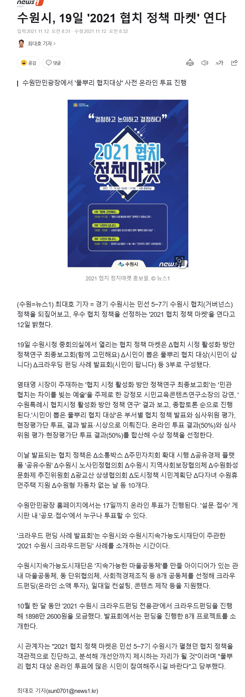 수원시, 19일 '2021 협치 정책 마켓' 연다
