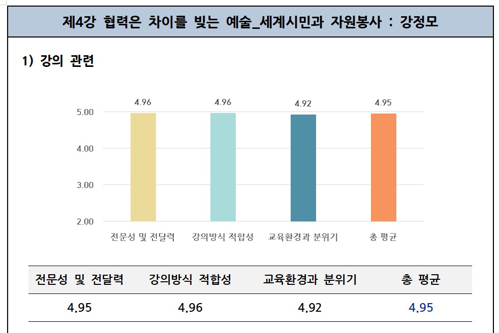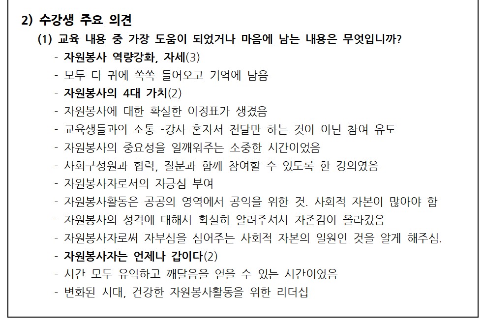 4회 차로 구성된 자원봉사대학에서 95% 이상의 높은 출석 및 수료율을 보이며, 성공리에 마쳤습니다.