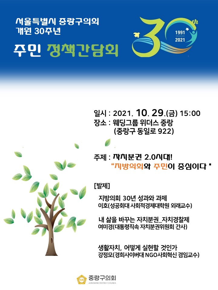 10월 29일 금요일 중랑구 위더스 중랑에서 중랑구의회 주최로 개원 30주년을 맞이하여 구의원과 주민 간