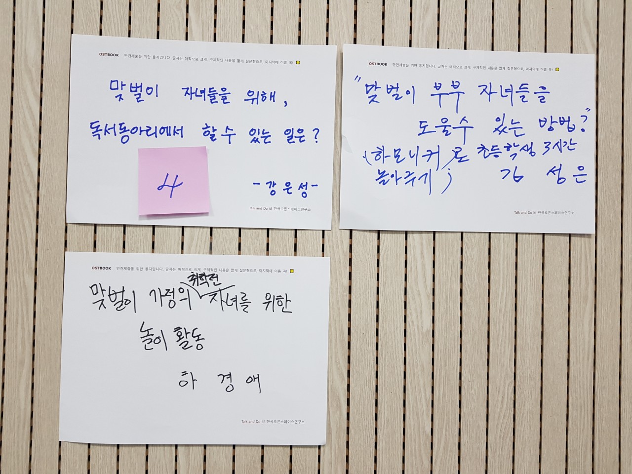 오픈스페이스 토론의 참여자들은 대주제에 부합하는 안건을 제출하거나 선택합니다.