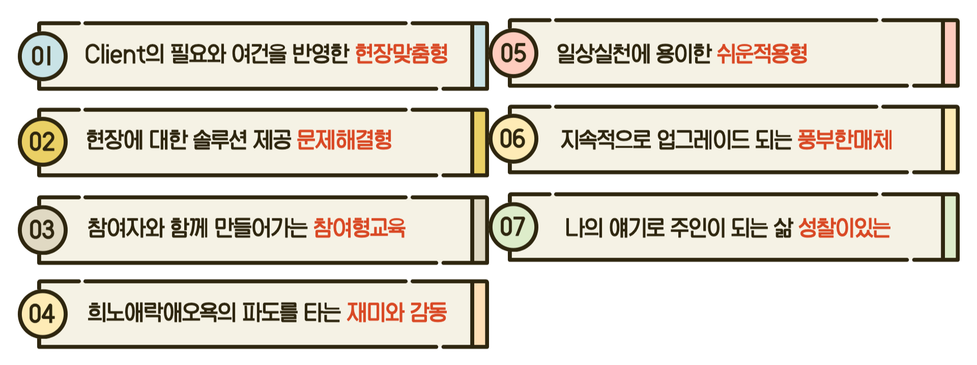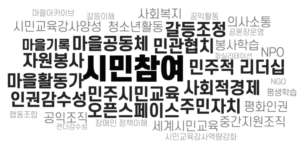 시민참여, 자원봉사, 봉사학습, 청소년활동, 민주적 리더십, 공익조직, 공익활동, NGO, NPO, 중간지원조직, 주민자치, 민관협치, 마을공동체, 평화인권, 인권감수성, 민주시민교육, 평생학습, 갈등이해, 갈등조정, 의사소통, 퍼실리테이션, 모더레이션, 회의방법, 토론회, 공론장, 사회복지, 장애인 정책이해, 젠더감수성, 세계시민교육, 마을기록, 마을아카이브, 사회적경제, 협동조합, 시민교육강사양성, 시민교육강사역량강화, 공론장운영, 마을활동가, 오픈스페이스