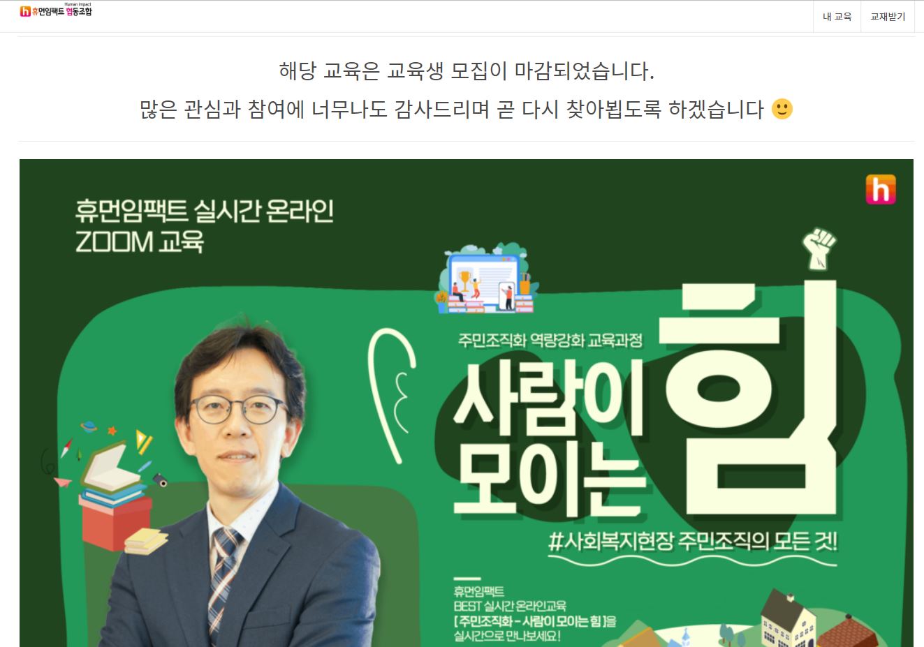 사회복지사 전문교육 기관 휴먼임팩트 협동조합에서 실시하는 주민조직화 줌 강의를 실시하였습니다. 작년에 이어서 올해도 연속 조기마감되었습니다. 성원에 감사드립니다.