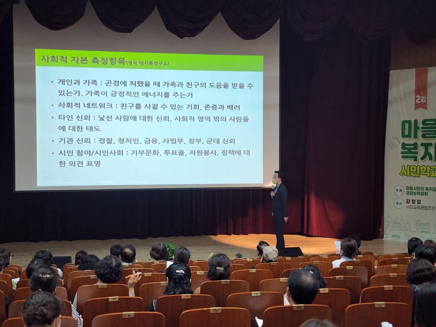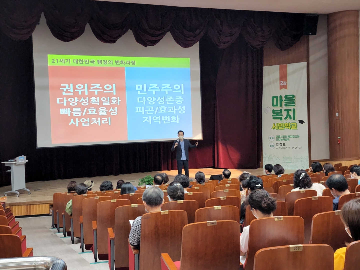 22년 8월19일 광산구 첨단1동 지역사회보장협의체에서 "마을복지시민학교"에 주 강사로 초대해주셨습니다. <마을시민의 복지감성과 공감능력 발휘>라는 감성적 주제로 행정복시센터 대강당에서 주민자치위원, 지역사회보장협의체 위원과 관심있는 마을주민들을 대상으로 실시하였습니다.