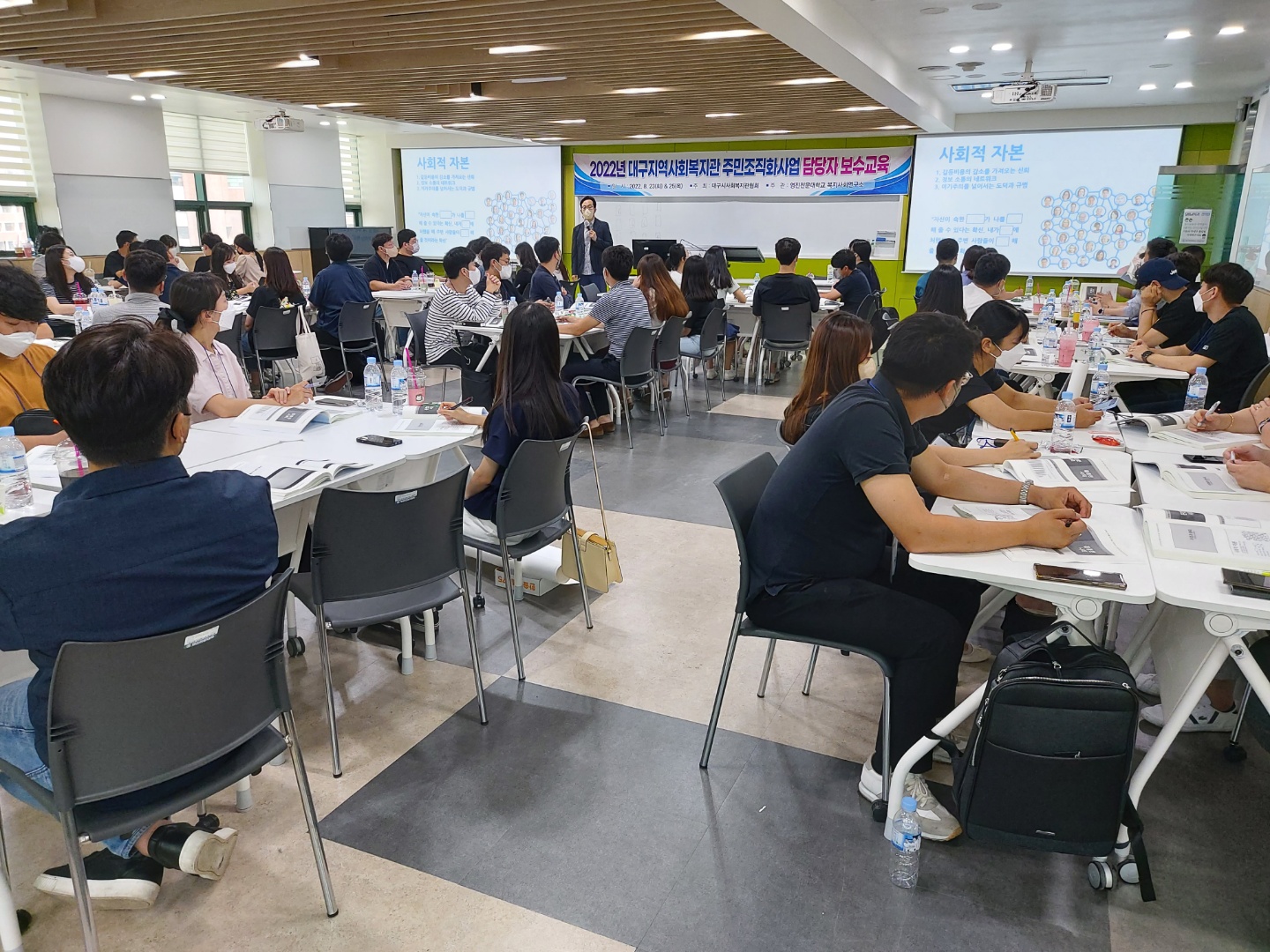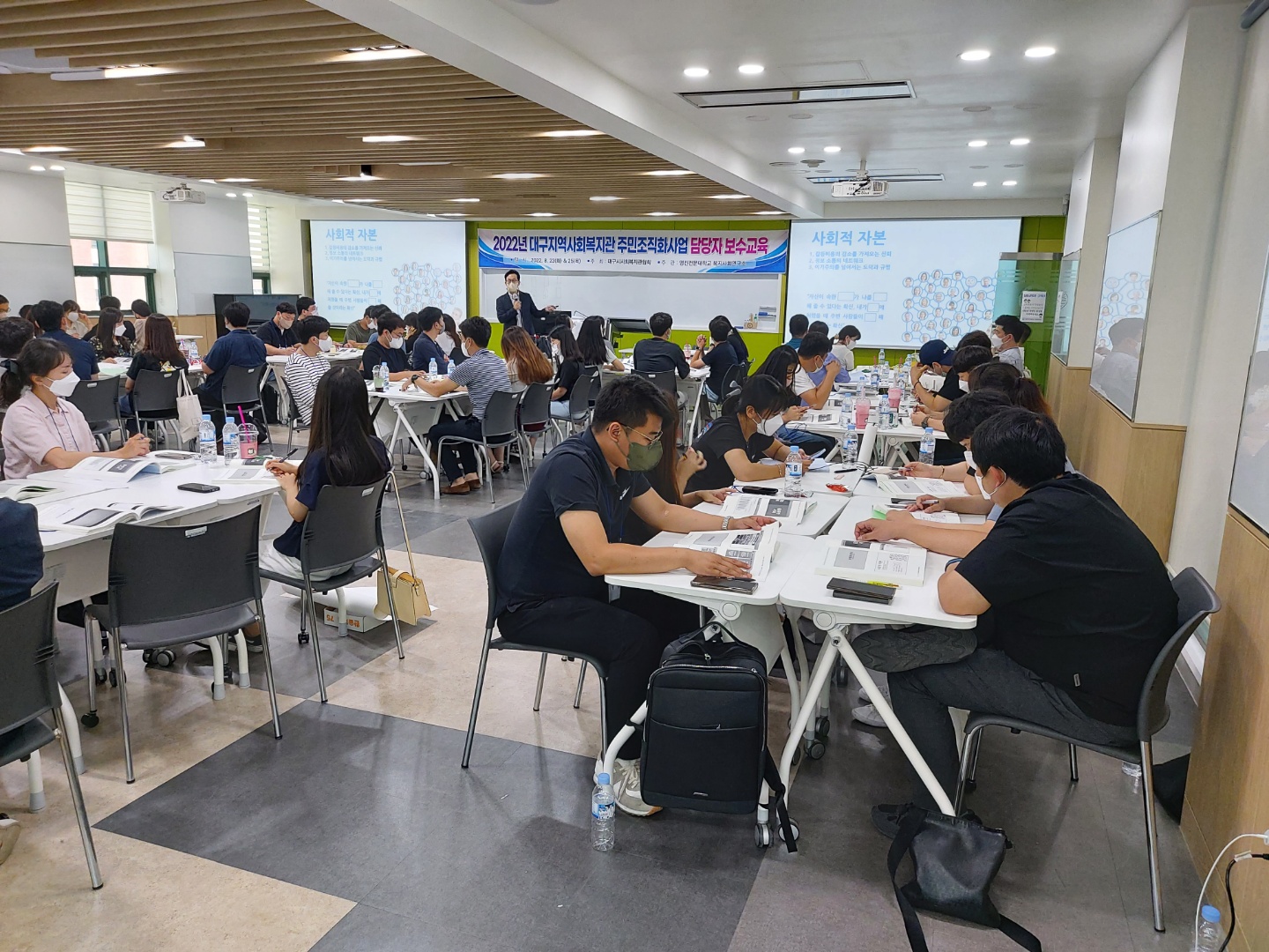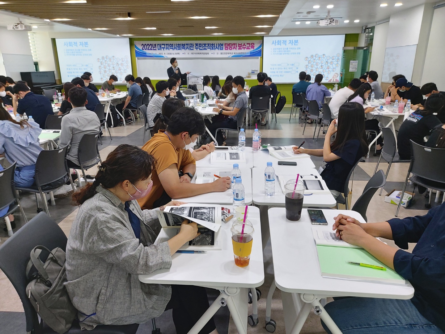 22년 8월 25일 대구영진대학교에서 대구지역사회복지관 주민조직화사업 담당자 보수교육을 실시하였습니다. 대구지역사회복지관 및 사회복지유관기관에 종사하시는 사회복지사 100여명을 대상으로 7시간 동안 주민조직의 모든 실행역량을 다뤘습니다.