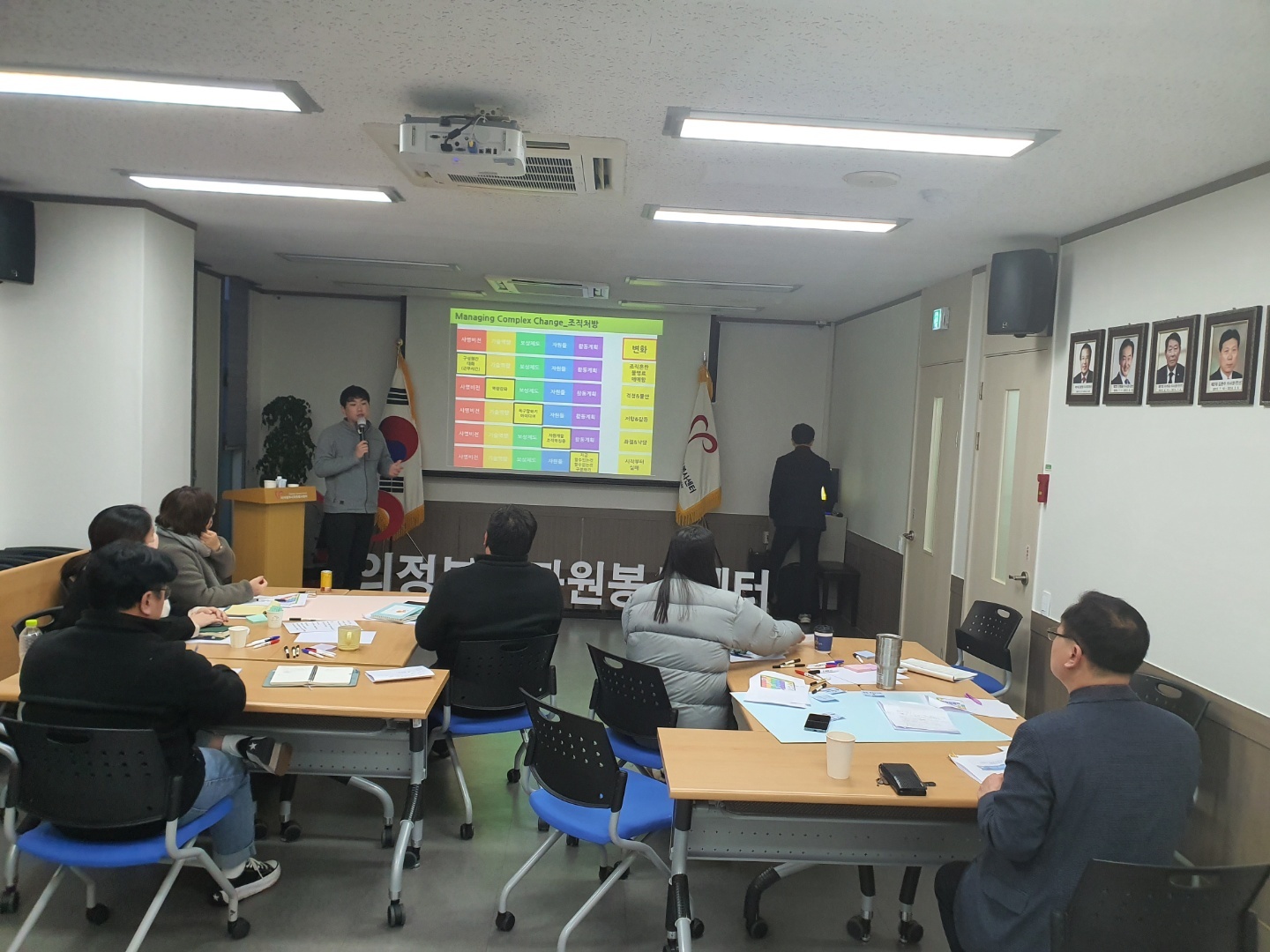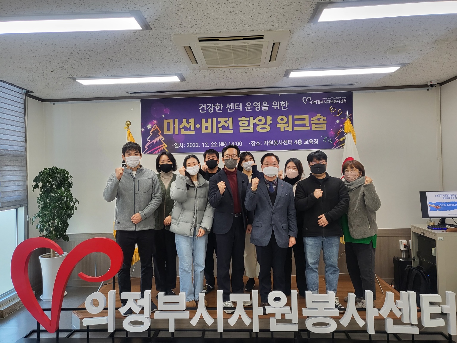 22년 12월 22일 의정부시자원봉사센터는 연말 한 해의 주요 사업을 마무리하고, 조직을 점검하고, 돌아보며, 향후 나아갈 목적지를 모든 구성원들이 민주적으로 설정하는 "건강한 센터운영을 위한 미션, 비전 함양 워크숍"을 실시하였습니다.