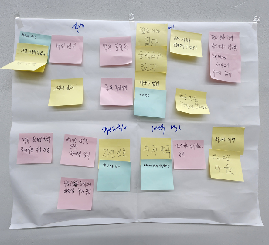 타 지역의 사례를 공유하면서 백곡면 특성에 맞는 의제가 무엇인지 토의하였고, 지역자원을 연계하여 백곡면의 문제를 해결할 수 있는 방법에 대해 논의하였습니다.