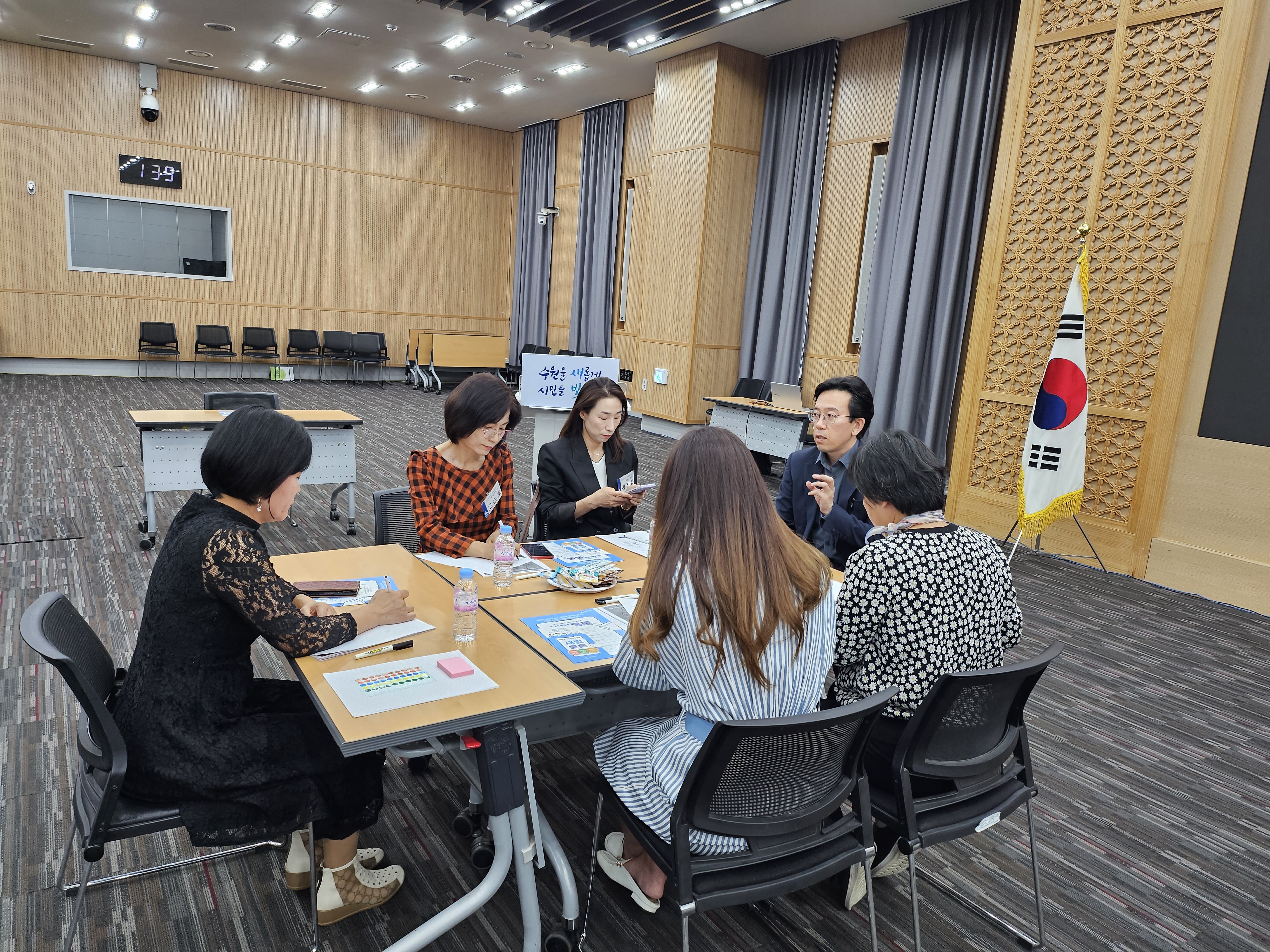 강정모 소장과 송문식 강사는 수원시민들에게 민관협치 의제 특징과 사례를 중심으로 이해하고, 수원시정 관련된 의제를 도출하여, 온라인 모바일 플랫폼인 '새빛톡톡'을 활용하여 내용을 기재하는 실습을 진행하였습니다.