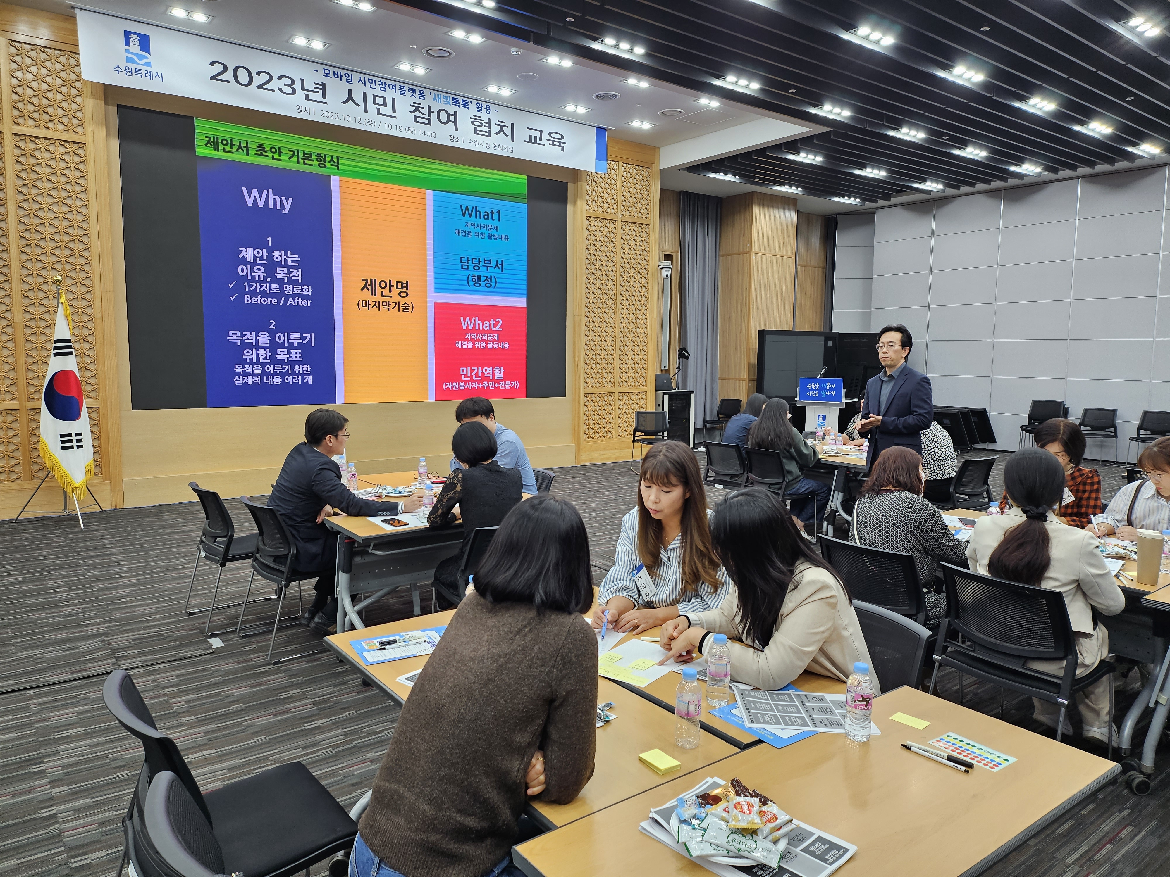 23년 10월 12일 수원시청 별관 중회의실에서 수원시에서 개발한 시민참여 플랫폼 ‘새빛톡톡’ 활용방법 워크숍을 실시하였습니다.