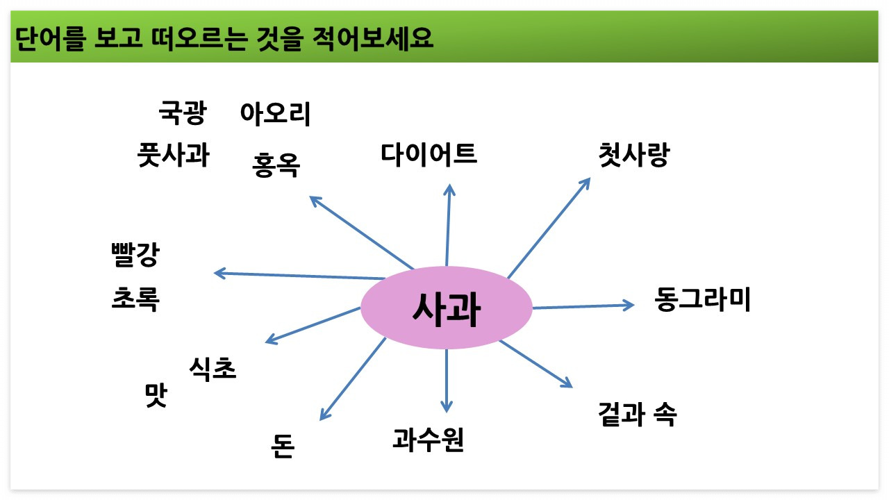 그리고 팀별로 2절지를 나눠주고, 가운데에 선정한 단어를 작성하도록 하고, 선정한 단어를 보고 연상되는 단어를 10개쯤 작성하여 그림으로 표현하도록 요청한다. 예를들면 어느 팀이 ‘사과’라는 단어를 선택하여, 연상단어를 도출하여 2절지에 작성했다면 아래와 같다.