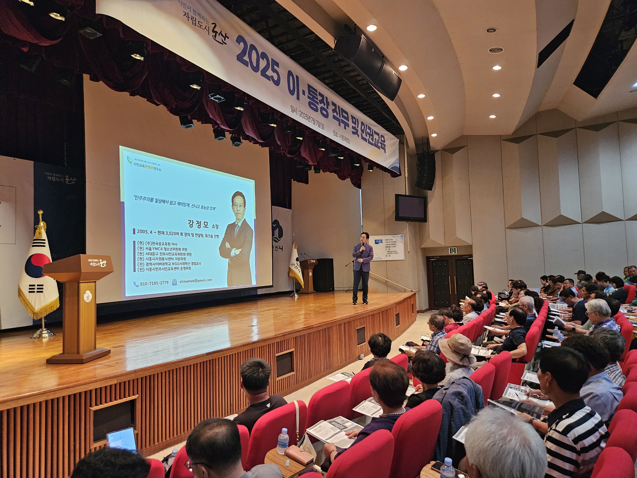 25년 7월 7일 군산시청 대강당에서 군산시 이통장 특강을 실시하였습니다. 450~500여 명이 참석한 초대형 강의였습니다. 모두들 의무교육 참석모드였습니다.
