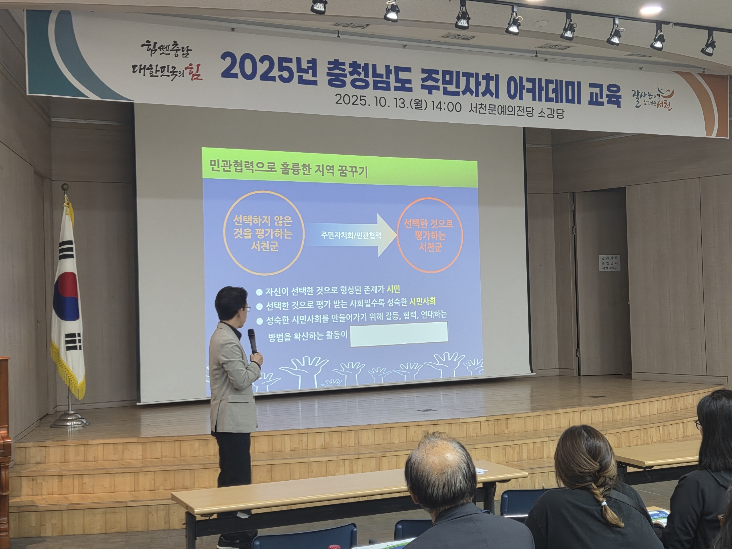 민관협력의 최전선에서 고군분투하는 위원님들의 마음을 어루만지고, "우리가 가는 길이 틀리지 않았다"는 확신을 주는 시간이었습니다. 스스로 지역의 문제를 선택하고, 실행하고, 책임지는 '진짜 주인'으로 거듭나고 있는 서천군 주민자치회 위원님들께 존경의 박수를 보냅니다. 시민교육콘텐츠연구소는 서천군의 아름다운 도전을 늘 응원하겠습니다.