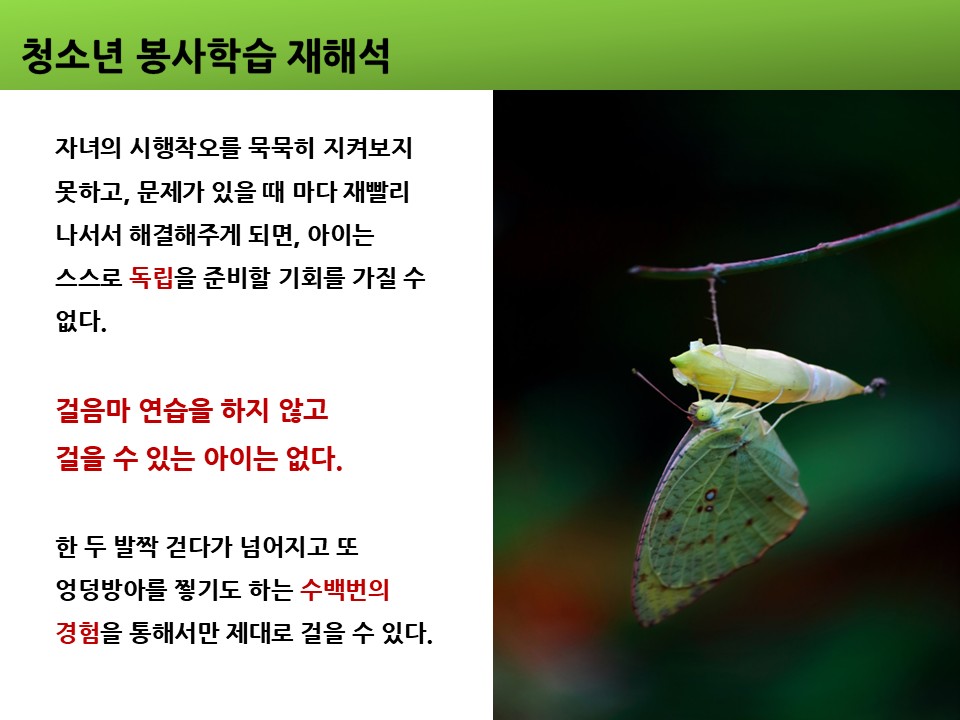 이날 교육의 핵심은 '봉사학습(Service Learning)'의 재해석이었습니다. 나비가 되기 위해 고치 밖으로 나오려 몸부림치는 애벌레를 안쓰럽게 여겨 누군가 가위로 고치를 잘라준다면, 그 나비는 평생 날지 못하고 죽게 됩니다. 날개에 힘을 공급하는 것은 바로 그 '처절한 몸부림'의 과정이기 때문입니다. "청소년 자원봉사는 아이들에게 '안전한 시행착오'를 허락하는 장이어야 합니다." 학교와 가정에서는 정해진 정답만을 강요받지만, 자원봉사 현장에서만큼은 스스로 기획하고, 실패하고, 다시 도전하는 과정을 통해 아이들은 비로소 스스로 걷는 법을 배웁니다. 이것이 바로 우리 강사님들이 교실에서 가르쳐야 할 진짜 수업입니다.