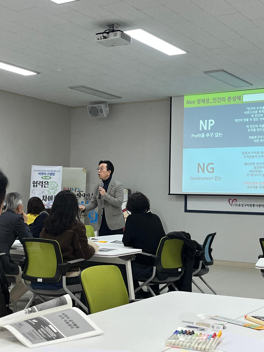 찬 바람이 불기 시작한 12월 2일, 대전 유성구자원봉사센터 교육장은 여느 때보다 뜨거운 열기로 가득 찼습니다. 국무총리비서실이 주최하고 (사)시민과 (사)공공이 의기투합하여 마련한 '비영리 스텝업 - 협력은 차이를 빚는 예술' 교육을 실시하였습니다. 12월 2일, 대전 유성구자원봉사센터에서 진행된 '비영리 스텝업' 교육은 현장의 치열함과 배움의 열정이 공존하는 시간이었습니다. (사)시민과 (사)공공이 함께 마련한 자리에, 대전 곳곳에서 마을과 사람을 잇는 25명의 활동가님이 함께해주셨습니다.