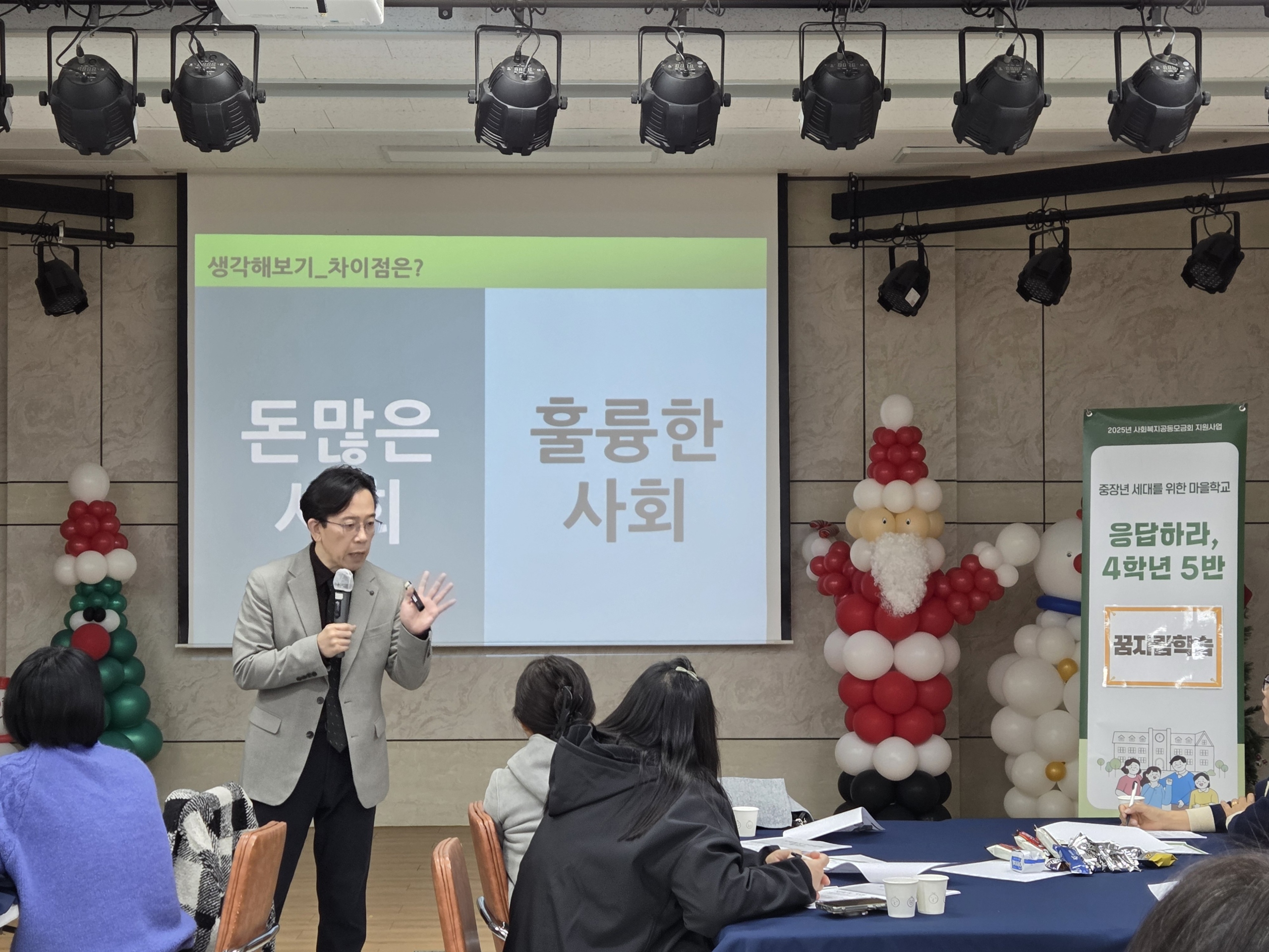 12월 10일, 대전 정림종합사회복지관에서 진행된 ‘응답하라, 4학년 5반(4050세대)’ 참여자 교육은, 우리 사회의 허리이자 가장 치열한 삶을 살고 있는 중장년층 주민들과 함께 ‘나’를 되찾고 ‘이웃’을 재발견하는 시간이었습니다. 대전 서구 정림종합사회복지관 강당은 40대, 50대 주민들의 활기찬 웃음소리로 가득 찼습니다. 마치 학창 시절로 돌아간 듯 설레는 표정의 이들은, 정림종합사회복지관이 야심 차게 준비한 중장년 사회적 관계망 형성 프로젝트 <응답하라, 4학년 5반>에 참여한 주민분들입니다. 이날은 막바지 활동시기에 활동을 회고하고, 향후 발전방향을 모색함에 앞서, “주민참여 활동 가치 토대 함양과 리더십”을 주제로, 우리가 왜 여기에 모였는지, 그리고 앞으로 어떤 ‘어른’으로 성장할 것인지를 고민하는 시간이었습니다.