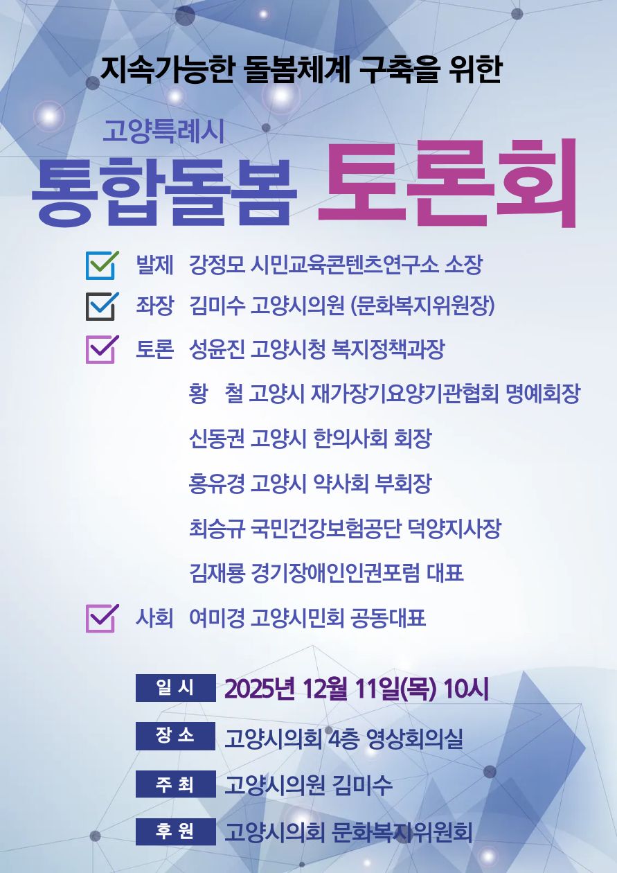 고양특례시의회는 지난 12월 11일 오전 10시, 시의회 4층 영상회의실에서 고양시 통합돌봄의 미래 과제를 논의하는 토론회를 개최했습니다. 이번 토론회는 고양시가 지난 2년간 추진해 온 시범사업의 성과를 돌아보고, 내후년 본격 시행될 ‘돌봄통합지원법’에 발맞춰 고양시만의 차별화된 돌봄 생태계를 구축하기 위해 마련되었습니다.