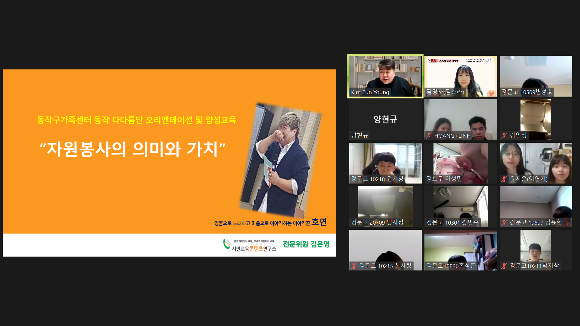 4월 2일, ZOOM을 통해 동작구 가족센터 <다문화 가족봉사단과 청소년과 함께하는 봉사활동의 가치와 의미 찾기>