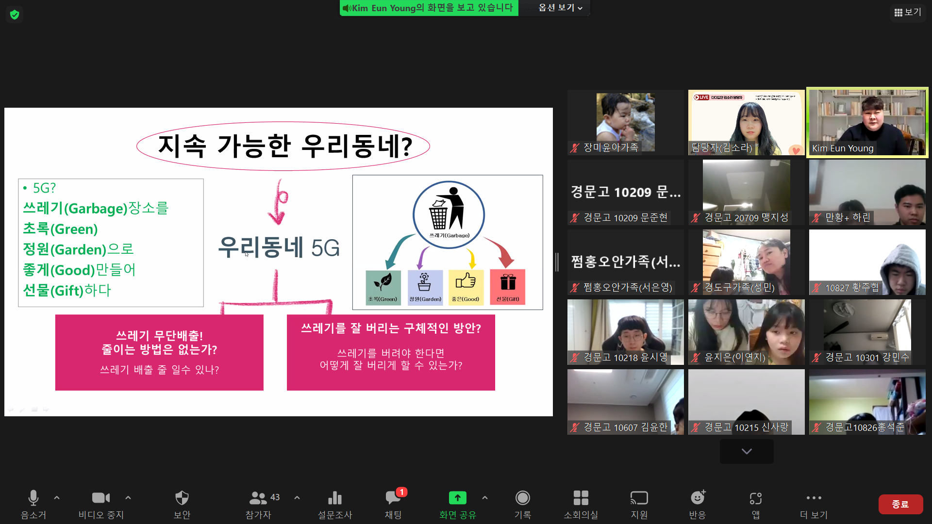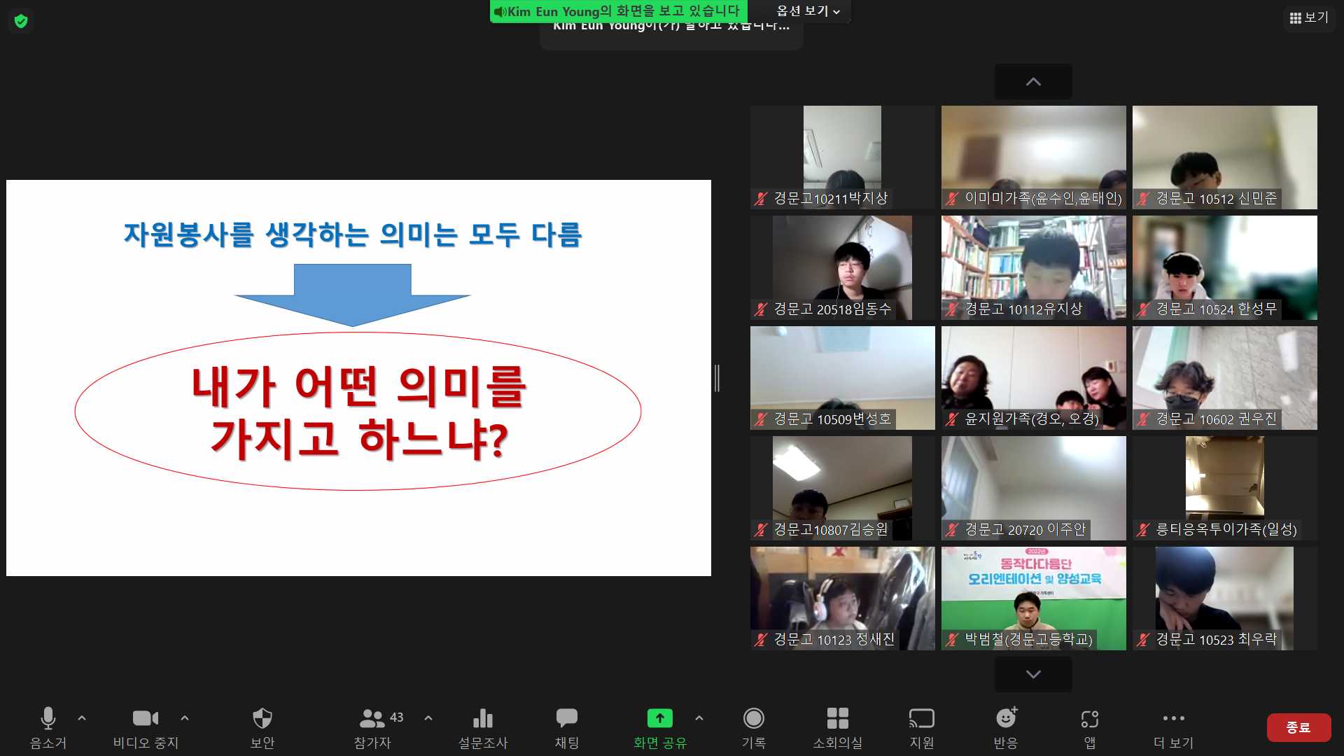 45명의 봉사자들이 ZOOM이라는 공간에서 서로 소통하고 상호간의 이야기를 경청하고 적극적인 참여로