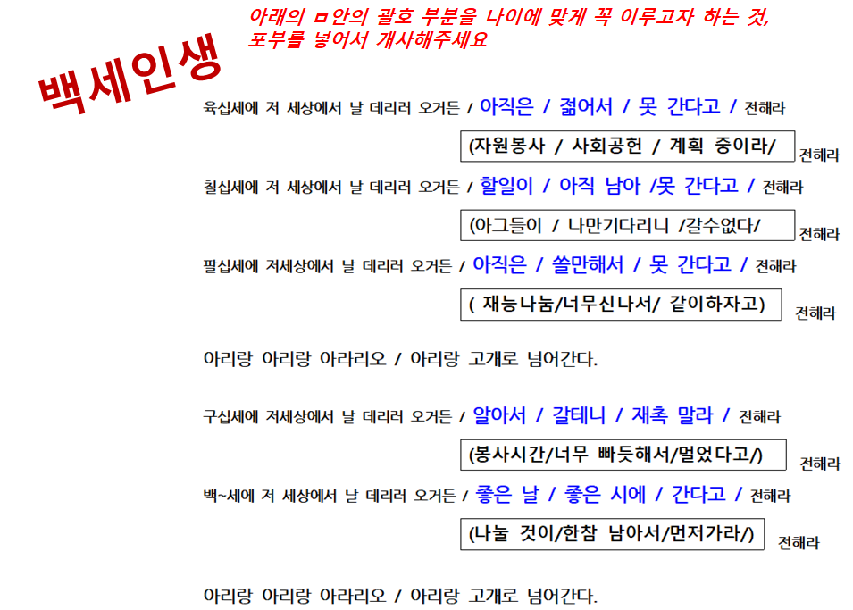 노후 준비를 계획하고 있는 자신에게 응원가로 “백세인생”(이애란) 개사를 통해 즐거움을 더할 수 있는