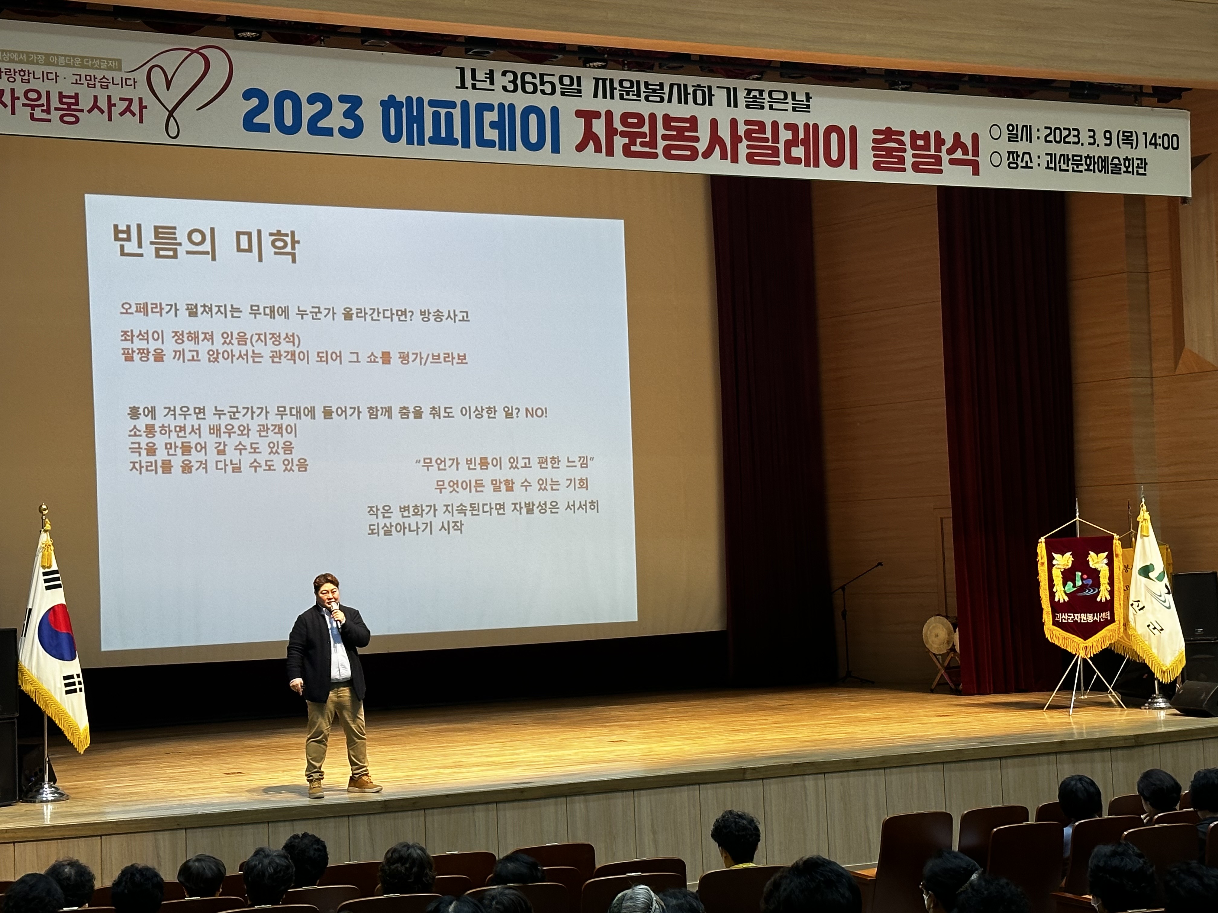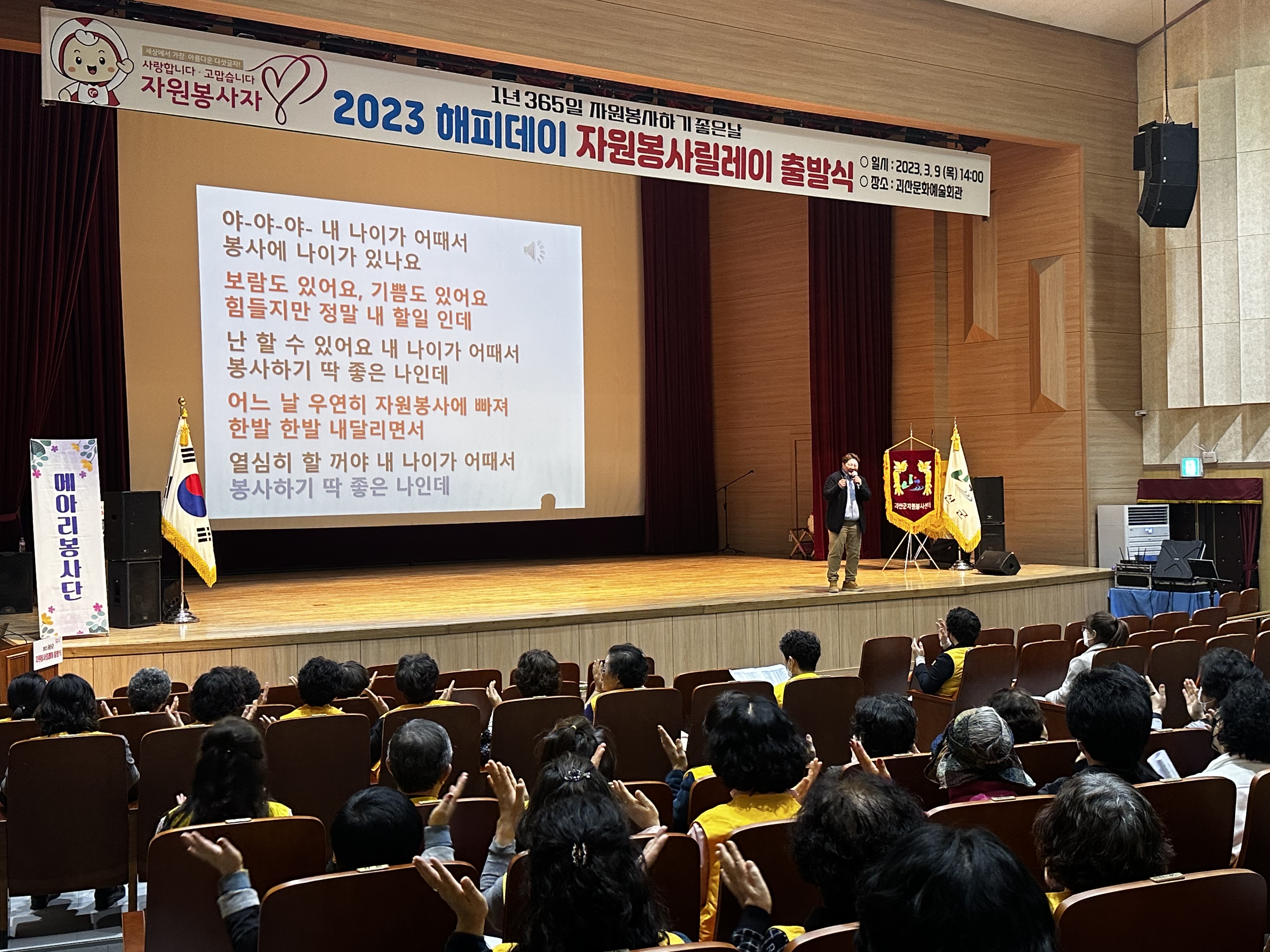 3월 9일 괴산군 자원봉사 단체장 및 회원 50여 명을 대상으로 <해피데이 자원봉사 릴레이 출범식>이 진행되었습니다. '자원봉사의 가치'를 주제로 '세상을 바꾸는 힘은 자원봉사'란 내용을 다뤘습니다.